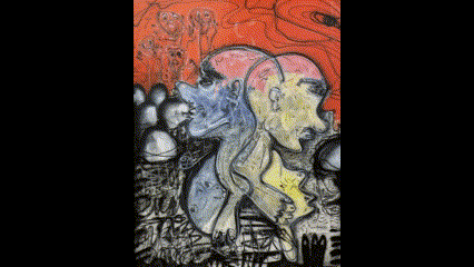 140.00 x 110.00 cm 2024 Acryl. Airbrush. Spraycan. Die Luft brannte rot von Chaos und Wut. Inmitten der aufgewühlten Menge, deren verzerrte Schreie die Nacht zerrissen, standen zwei Gestalten, untrennbar miteinander verbunden. Ihre Gesichter verschmolzen zu grotesken Fratzen des Zwiespalts – einer schrie vor Zorn, der andere weinte vor Angst. Um sie herum wogten die…