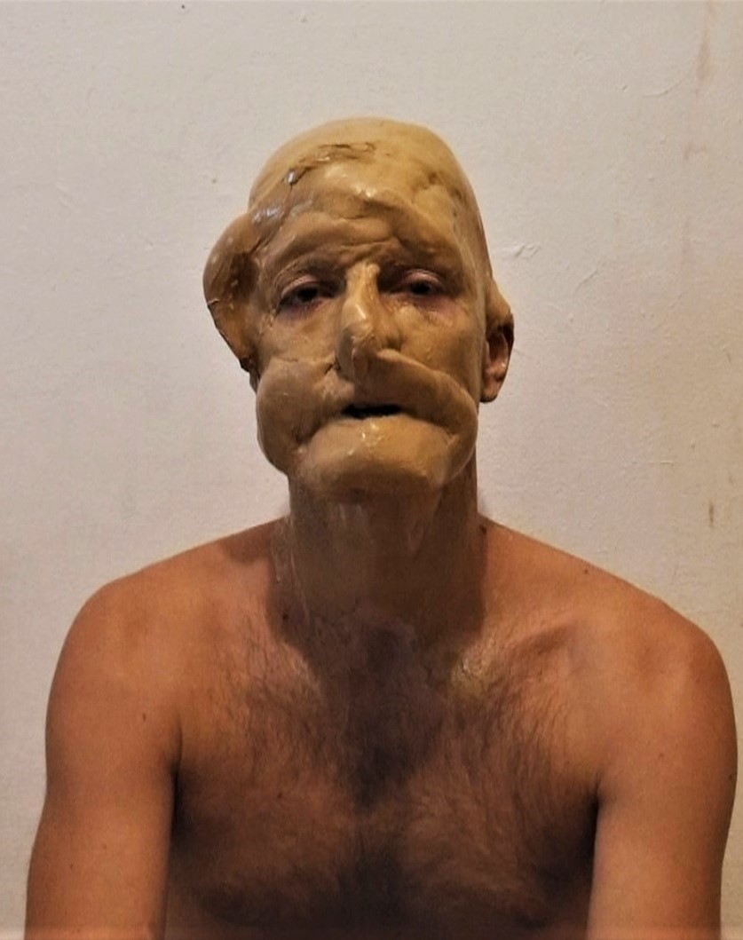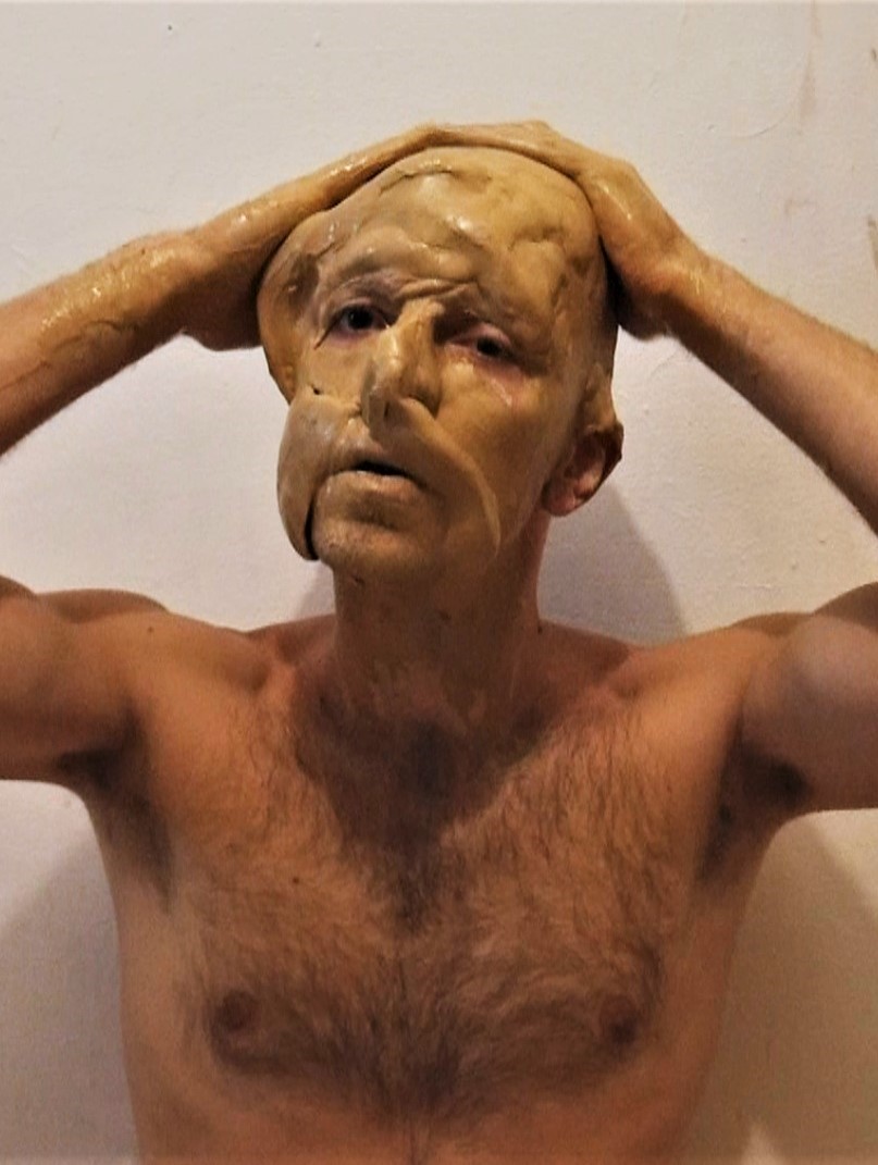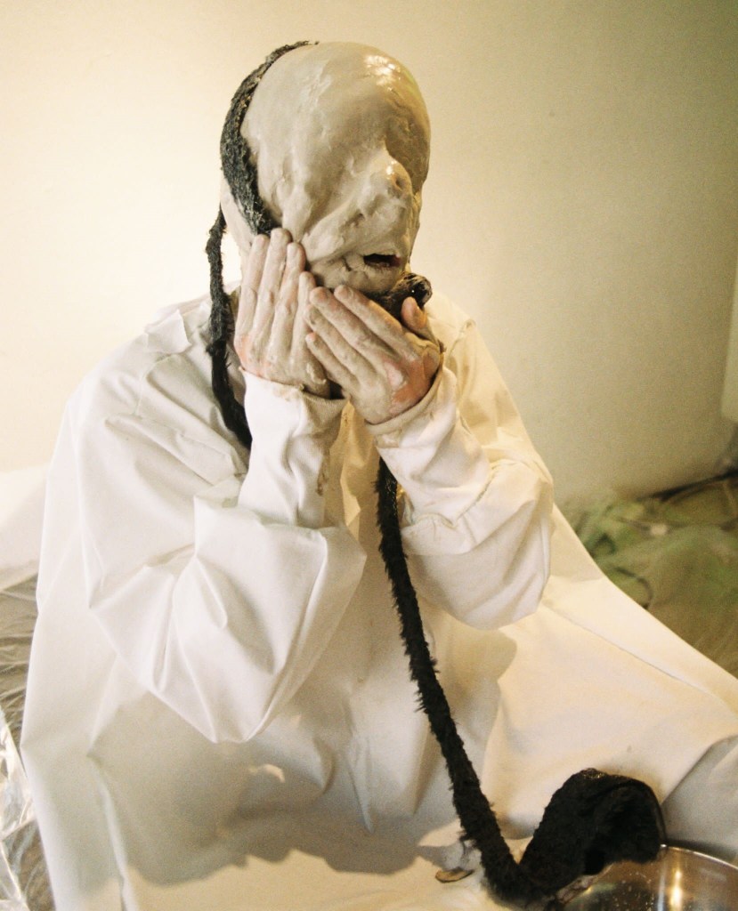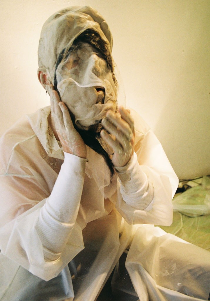 Während eines Zeitraums von zwei Stunden baue ich auf meinem Gesicht und um meinen Kopf herum langsam, sinnlich und stetig eine sich permanent im Wandel befindende Skulptur aus Ton. Am Ende schneide ich die Skulptur von meinem Kopf und lasse sie vor Ort trocknen.